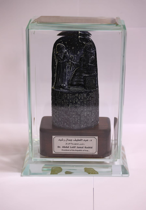 سلّم رئيس جمهورية العراق، الدكتور عبداللطيف رشيد، درع مسلّة حمورابي إلى رئيس ومؤسس مجموعة طلال أبوغزاله العالمية الرقمية، الدكتور طلال أبوغزاله.