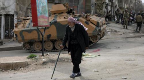 مسن كردي يمشي على عكاز في عفرين