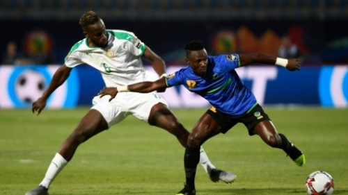 المدافع السنغالي ساليف سانيه (الى اليسار) يتنافس على الكرة مع التنزاني سيمون موسوفا