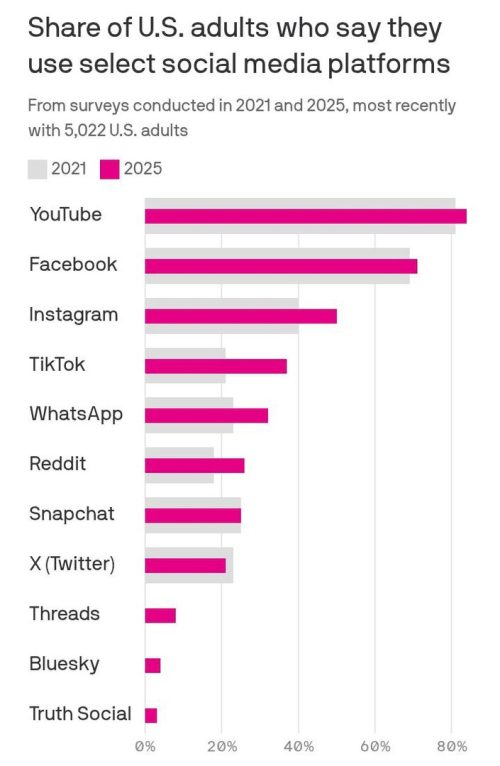 ووفقاً لاستطلاع الرأي الذي شمل 5022 بالغاً في الولايات المتحدة، يواصل موقع "يوتيوب" هيمنته المطلقة على المشهد الرقمي بنسبة استخدام بلغت 84%، يليه "فيسبوك" بنسبة 71%، ثم "إنستغرام" بـ 50%. وعزا التقرير استقرار هذه المنصات إلى أقدميتها (تأسست بين 2004 و2010)، مما أتاح لها وقتاً كافياً للتحول إلى جزء أساسي من الروتين اليومي والمنظومة الإعلامية للمستخدمين.