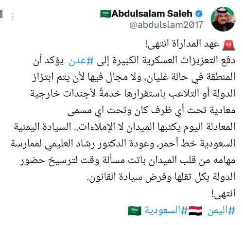 وجاءت هذه التصريحات عبر منشور رسمي على منصة "إكس"، أعلن فيه انتهاء ما وصفه بـ"عهد المداراة"، مؤكدًا أن التعزيزات العسكرية المتجهة إلى عدن تعكس حالة غليان، وأن المرحلة ”بحسب تعبيره “ لم تعد تحتمل ما اعتبره ابتزازًا أو عبثًا باستقرار الدولة.